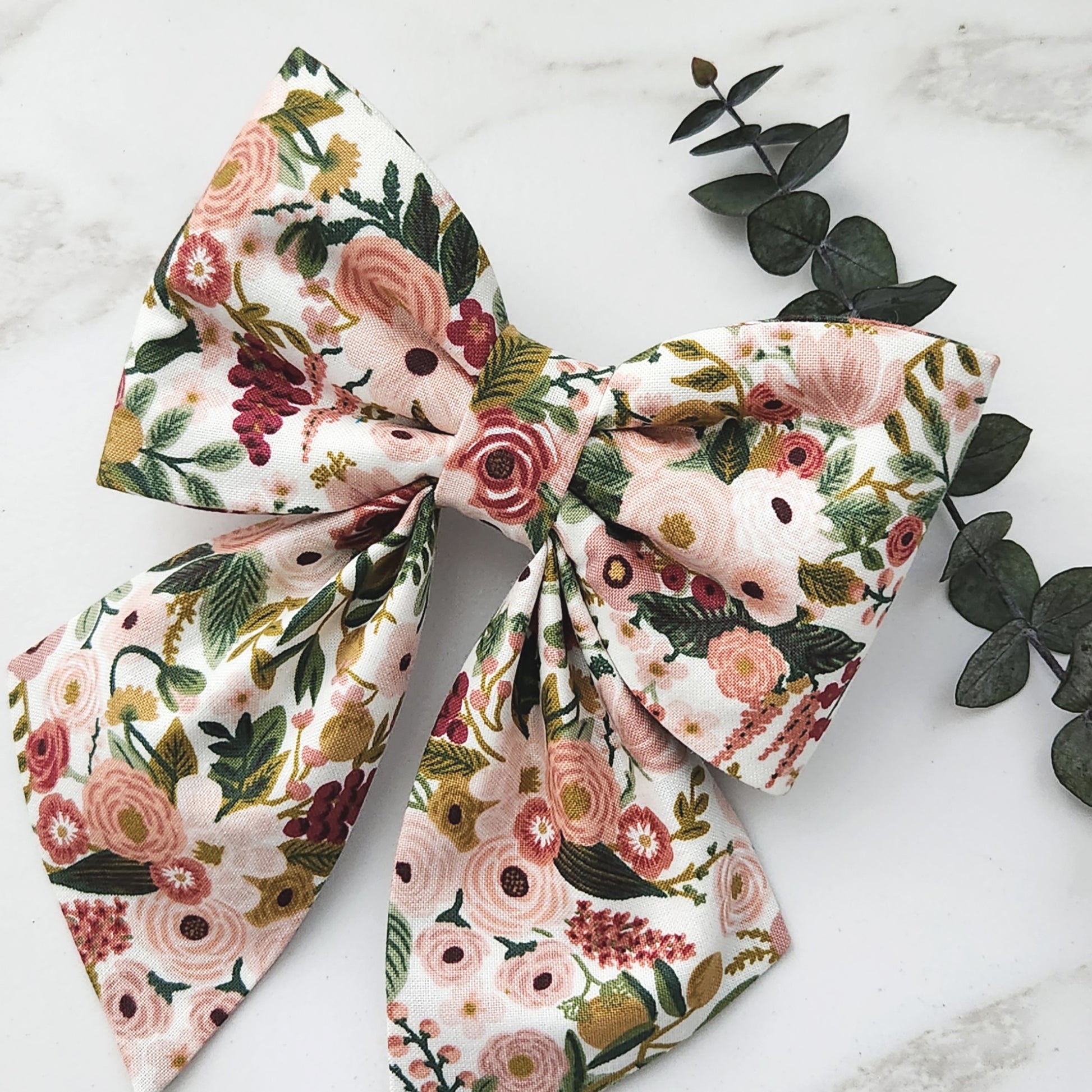 Our sophisticated pink rose dog bow for girls is custom made from cotton Garden Party Rose fabric, designed to gracefully attach to your pet’s collar. Its delicate floral design adds an elegant accent that complements your dog's natural beauty, perfect for both everyday wear weddings and special occasions.The bows attach securely to the collar with Velcro Brand tape in sizes for small, medium, large and x-large dogs. Each bow looks slightly different due to the large print on the fabric.