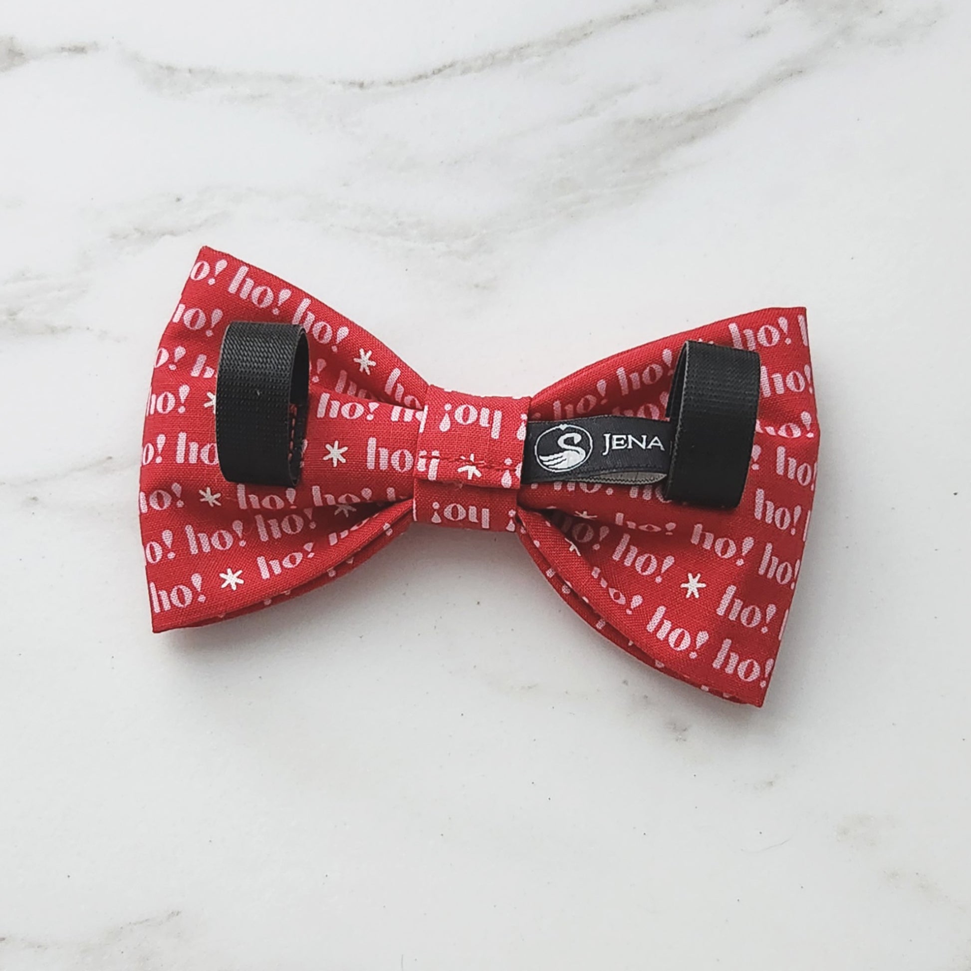 Our red Christmas dog collar bows and bow ties with Ho Ho Ho white print are a festive accessory for your beloved companion. Our handmade accessories feature a cheerful holiday design that captures the spirit of the season while maintaining style. Perfect for holiday photos, special celebrations, or simply spreading cheer, our custom made bows and bow ties attach securely to any collar with Velcro Brand tape. Crafted with attention to detail, they're an ideal way to include your furry friend in your Christmas festivities with understated charm and holiday flair.