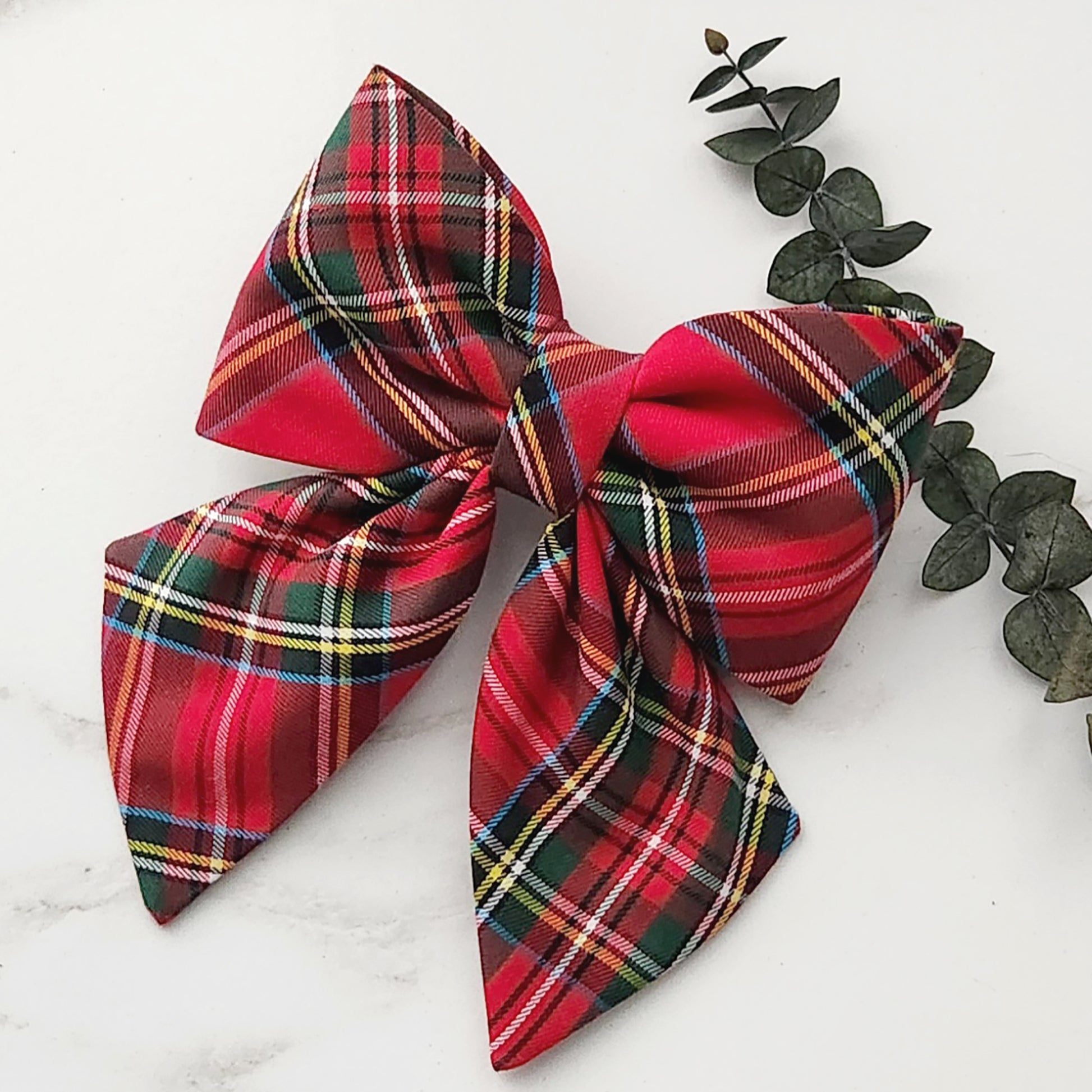 Our red tartan dog sailor bows for Christmas are sure to add a touch of classic style to your dog's collar this holiday season. These custom made bows, featuring the iconic red plaid inspired by traditional tartans, are custom made for small, medium, large and x-large dogs. Give your furry friend a fashionable look this festive season with our charming collar bows. Matching dog bow ties are also available.